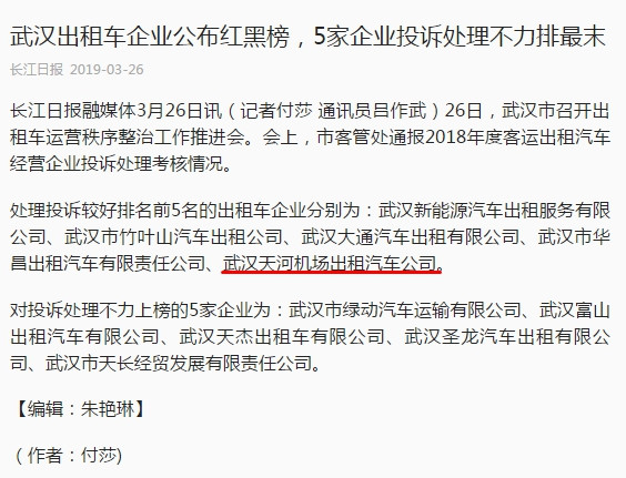? ?據(jù)長江日報融媒體3月26日訊,機(jī)總公司所屬武漢天河機(jī)場出租汽車公司在武漢市召開出租車運(yùn)營秩序整治工作推進(jìn)會上,被市客管處評為2018年度客運(yùn)出租汽車經(jīng)營企業(yè)處理投訴較好的紅榜企業(yè)。